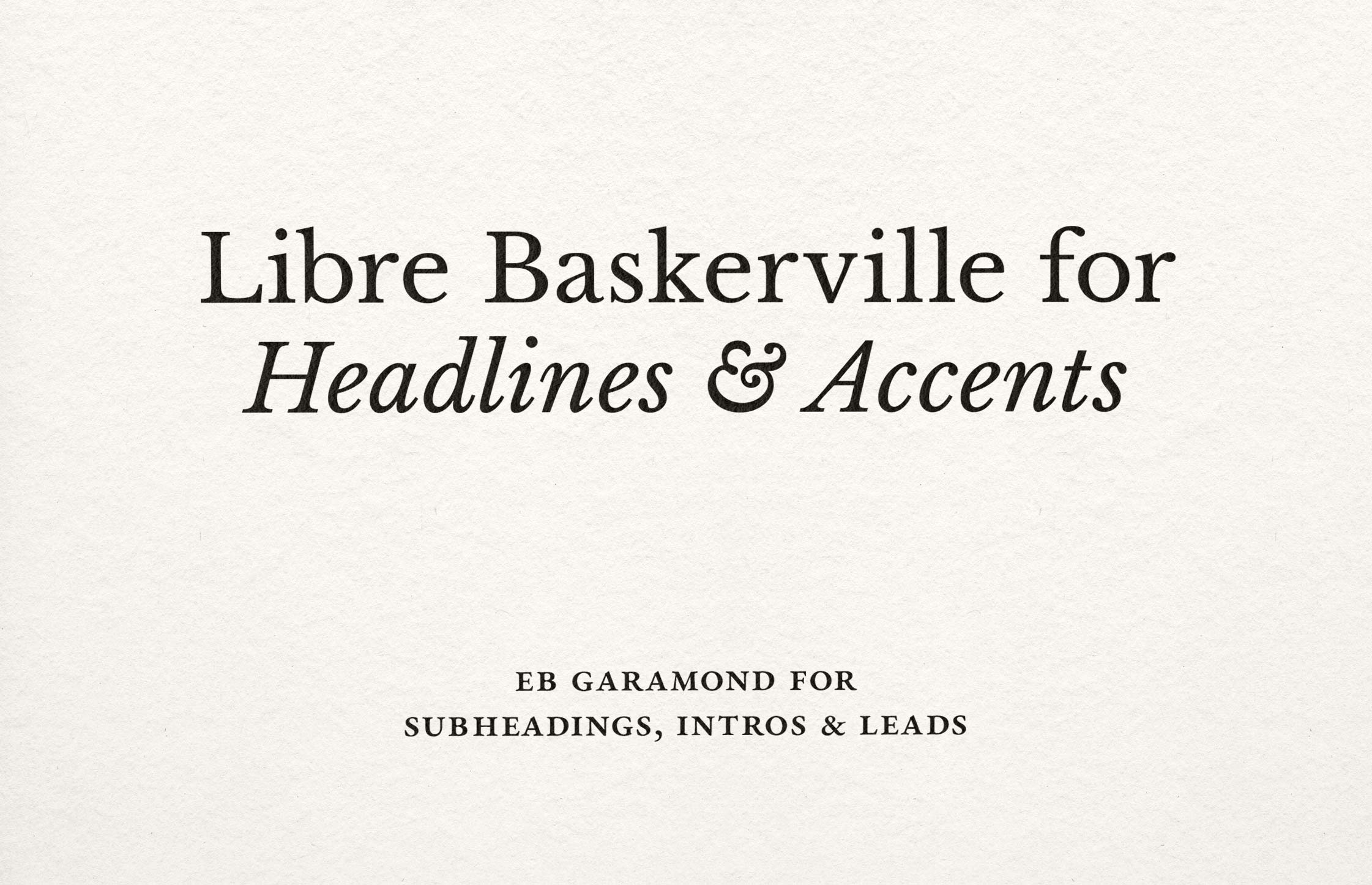 With inspiration from classic literature and book design, the typeface Libre Baskerville were chosen for headlines, accent text, and body text, while EB Garamond written with small caps was chosen for sub-headlines. The san-serif typeface Urbanist was chosen as body text for digital applications, to achieve better legibility on screens.