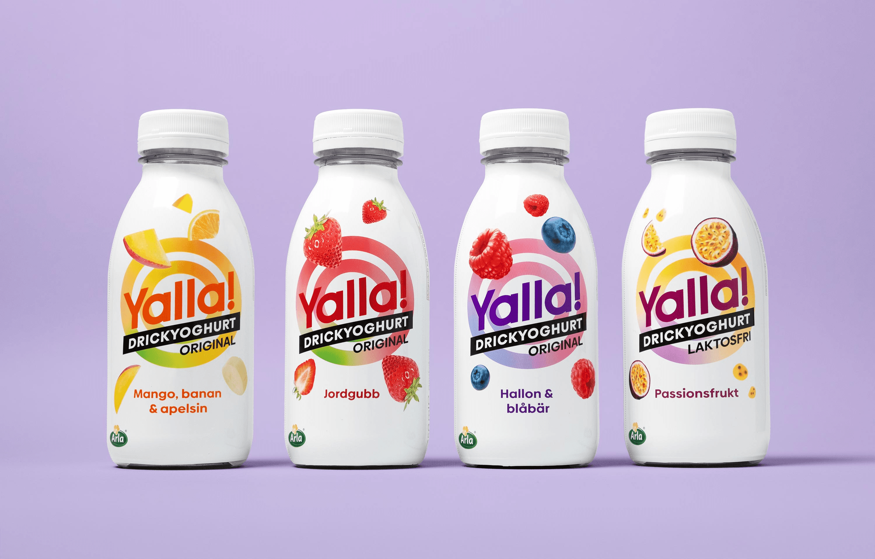 Arla wanted to bring the products within their on-the-go drinking yoghurt range closer together. The goal of this redesign was to create a louder, prouder, and more iconic Yalla by developing a logomark that would be clearly distinguishable across all products, while also better highlighting the flavours and functions of each product.